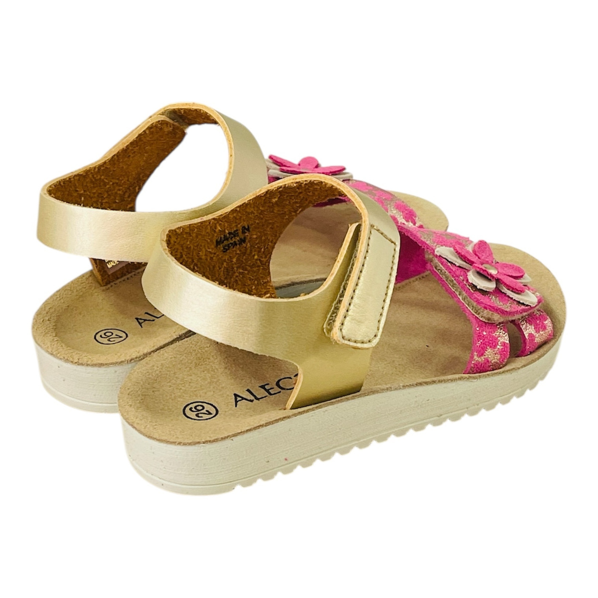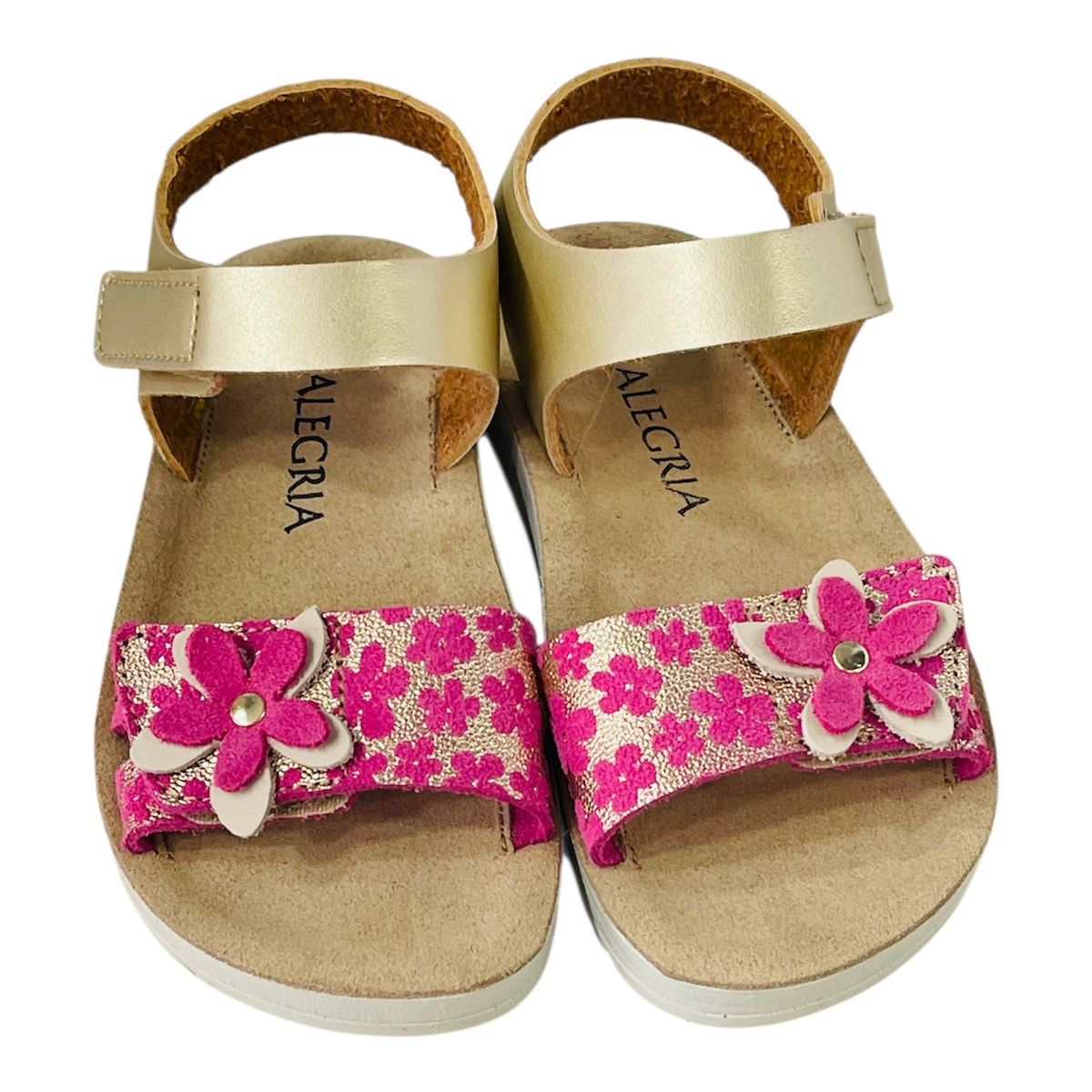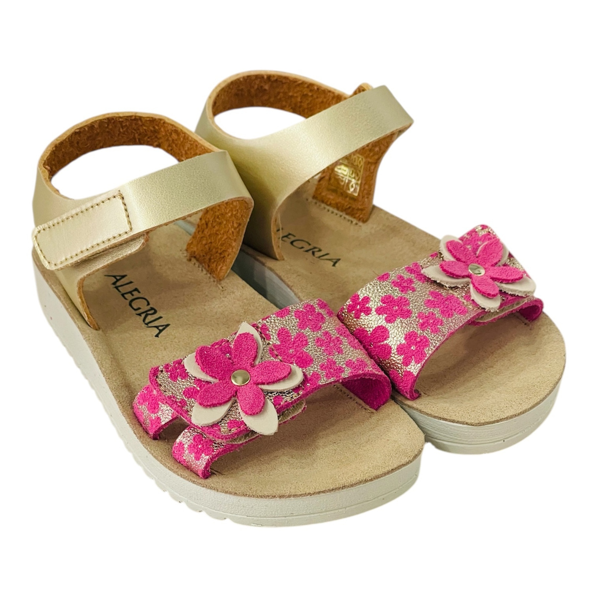 Παιδικά ανατομικά πέδιλα με φελλό από την ισπανική εταιρεία Alegria διακοσμημένα με Χρυσή όψη και εντυπωσιακή μαργαρίτα φούξια στο βέλκρο του παπουτσιού. Κατασκευασμένα εξωτερικά από ανθεκτικό συνθετικό υλικό και εσωτερικά με δερμάτινο ανατομικό πάτο. Διαθέτουν σόλα αντιολισθητική με έντονο χρώμα για ασφάλεια και άνεση σε κάθε πάτημα. Δένουν με αυτοκόλλητα σε ένα σημείο, κρατώντας το παιδικό πόδι πολύ σταθερό. Έχουν άνετη γραμμή και προτείνονται για καλοκαιρινές βόλτες..θα το λατρέψουν οι μικρές μας φίλες.