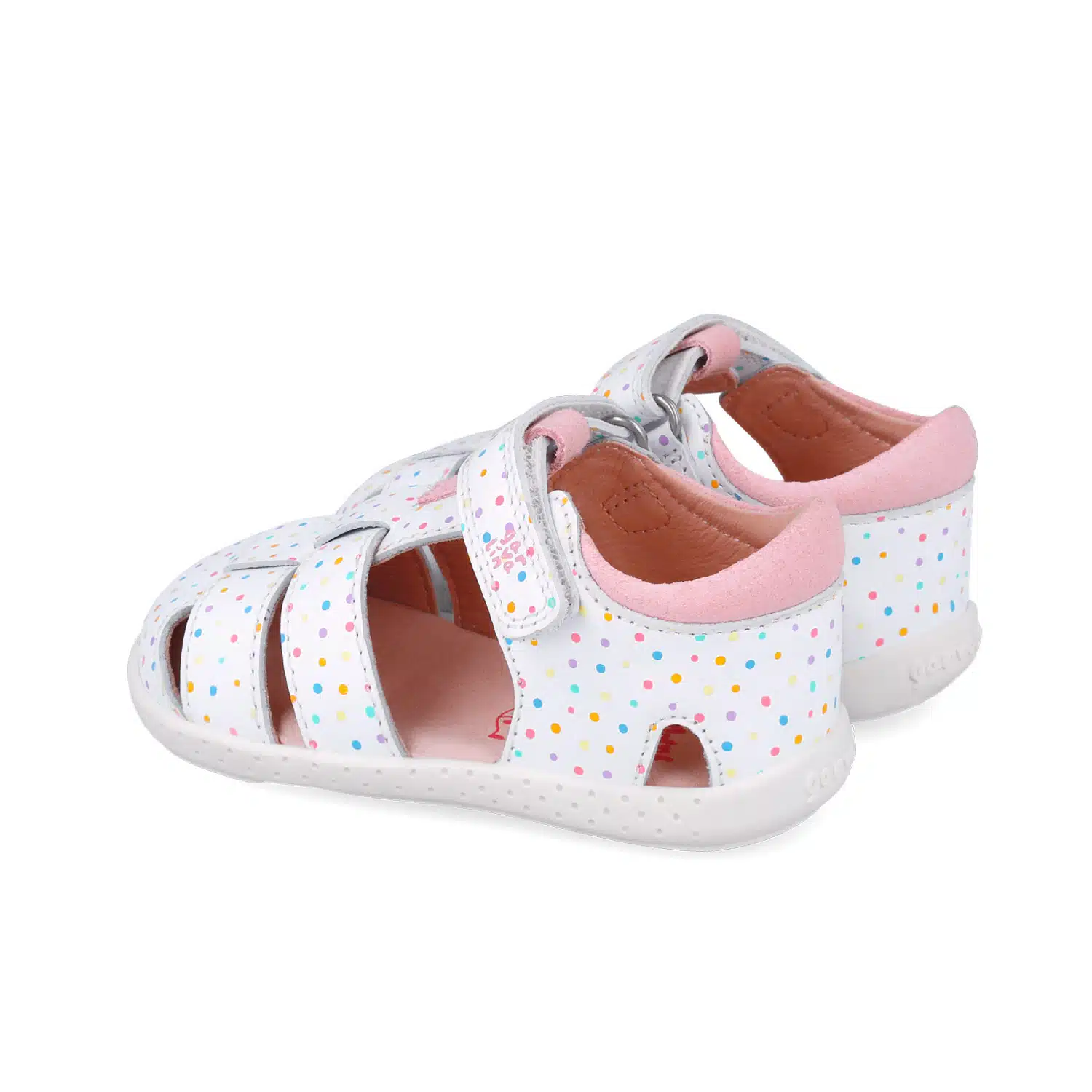 Λευκά ξυπόλητα δερμάτινα σανδάλια με πολύχρωμα πουά για κορίτσια.