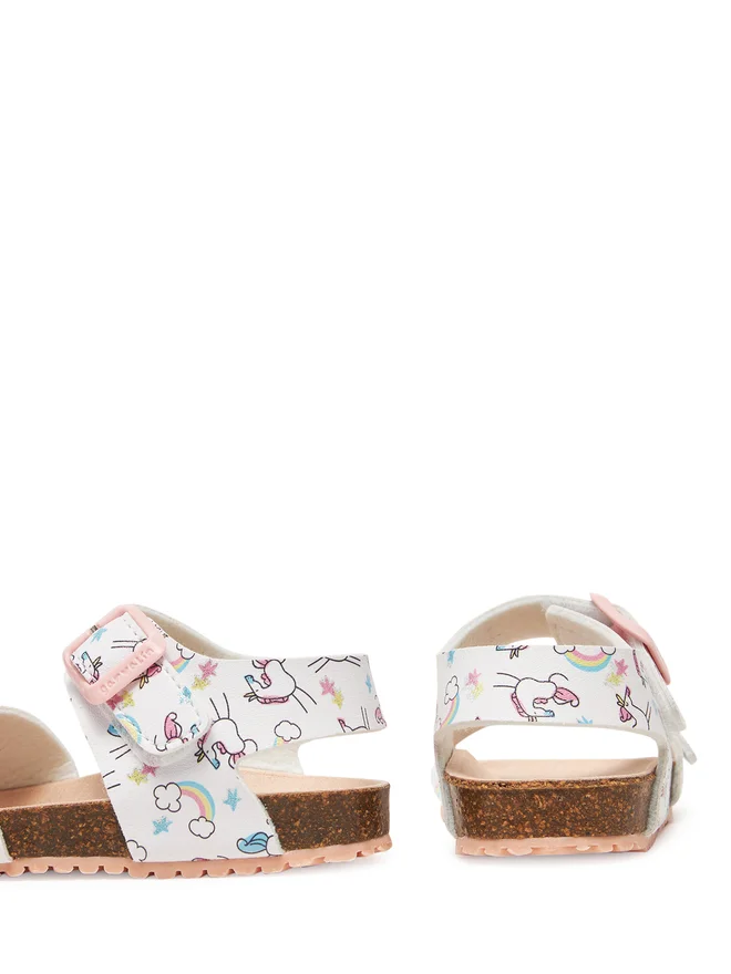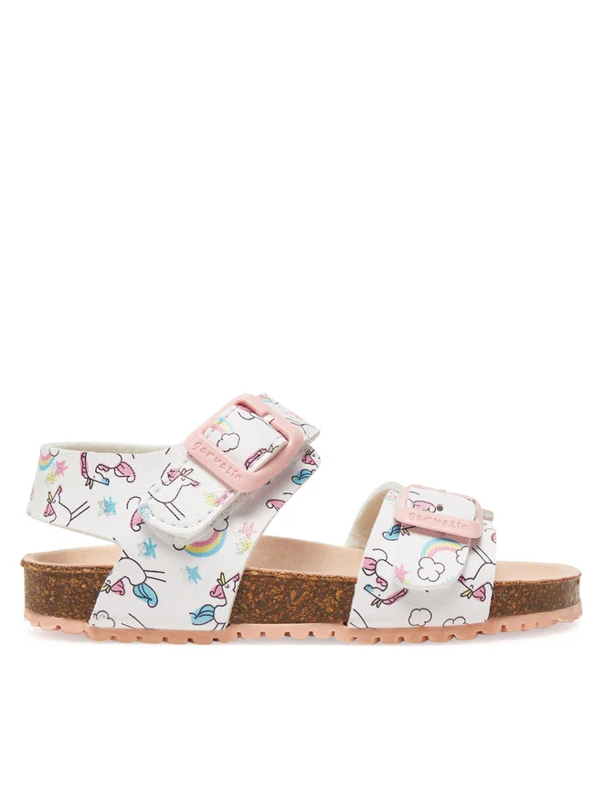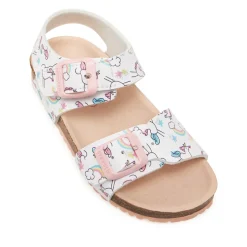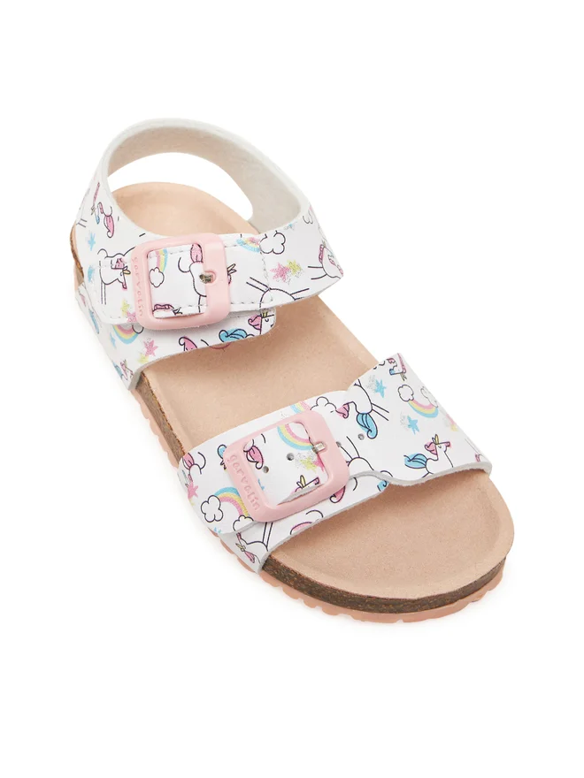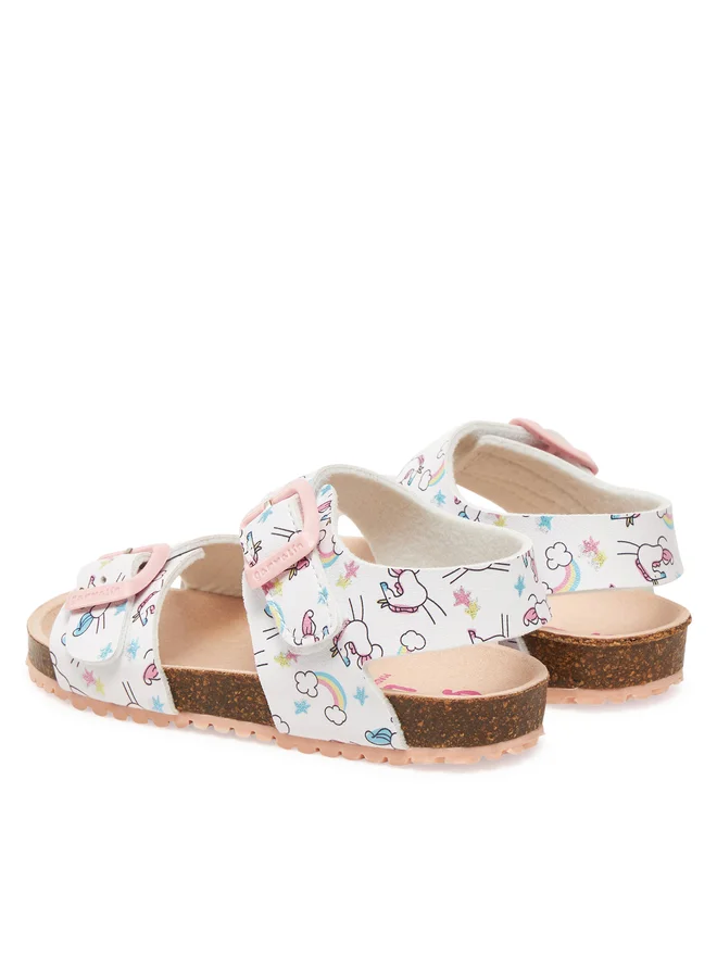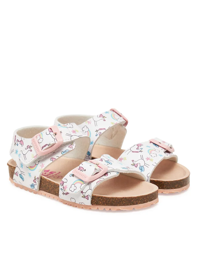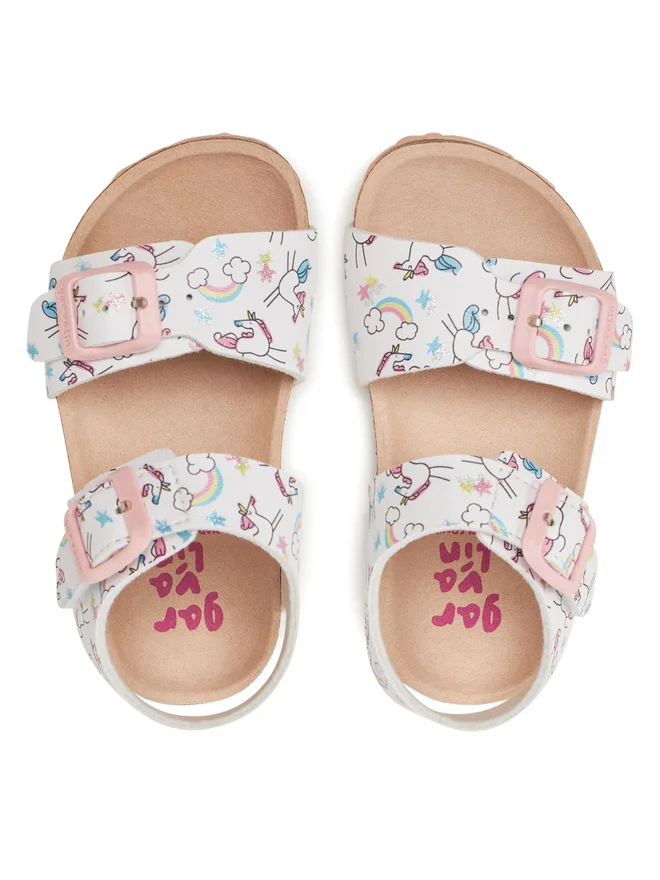 Παιδικά πέδιλα με ανατομικό πέλμα,τύπου σκαφάκι,σε λευκό χρώμα με πολύχρωμες Unicorn και Rainbow λεπτομέρειες.Διαθέτουν ανατομική βάση σόλας, κατασκευασμένη από ύφασμα, παρέχοντας τέλεια εφαρμογή, καθώς είναι κατάλληλα σχηματισμένη για το πέλμα.Η κυρίως σόλα είναι εξαιρετικά ελαφριά, φτιαγμένη από υλικό EVA (φελλός και λάτεξ), διαμορφωμένη ώστε να απορροφά τους κραδασμούς.