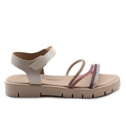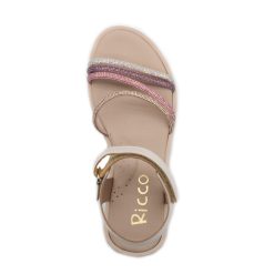 Δερμάτινο πέδιλο της εταιρείας Ricco Mondo στο Nude χρώμα  με ανατομία και με πολύ όμορφες λεπτομέρειες στα λουράκια από γκλίτερ στο μπροστινό μέρος.Το δέσιμο γίνεται με λουράκι και διαθέτει επίσης αντιολισθητικό πάτο.