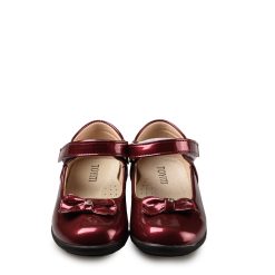 Η ΤΟΥΙΤΙ είναι μία χαριτωμένη μπαρέτα. Το επάνω μέρος είναι κατασκευασμένο από μπορντώ λουστρίνι με δερμάτινη επένδυση που βοηθά τα πόδια να κρατούνται φρέσκα. Διαθέτει ελαστικό λουράκι για γρήγορη και εύκολη εφαρμογή. Στο μπροστινό μέρος έχει έναν πολύ όμορφο διακοσμητικό φιόγκο. Η σόλα είναι από καουτσούκ που είναι ανθεκτική και παρέχει καλή πρόσφυση.